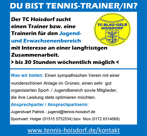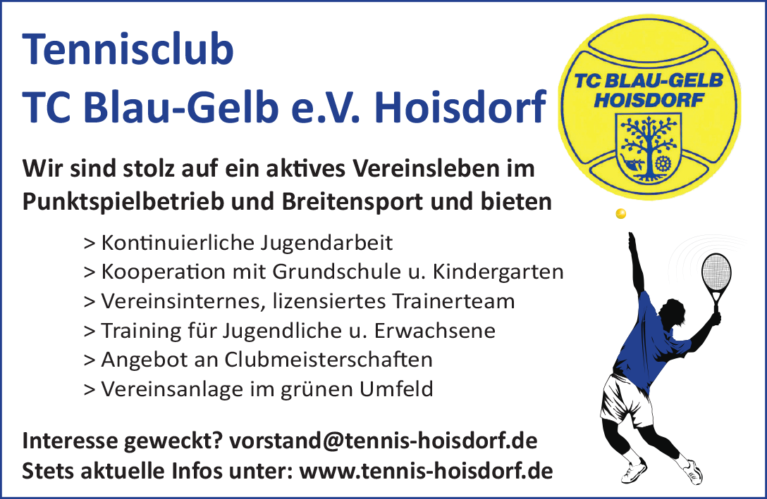 Mit der „Anzeige“ ist eigentlich alles gesagt. Wer für sich und / oder seine Kinder noch auf der Suche nach der richtigen Sportart ist oder bereits weiß, dass es Tennis sein wird, meldet sich einfach bei uns! Regelmäßige Infos gib es neben unserer website auch über unseren Instagram-Account tc_blaugelb_hoisdorf