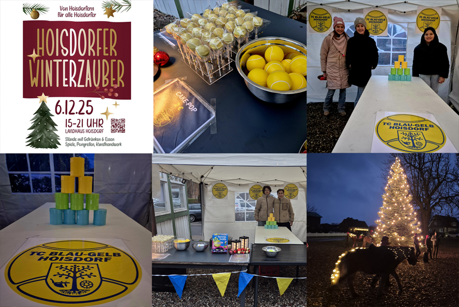 06.12.2025 – Am Nikolaustag von 15 bis 21 Uhr fand am Landhaus der Hoisdorfer Winterzauber 2025 statt. Ausgerichtet von Hoisdorfern für Hoisdorfer. Viele ortsansässige Vereine haben den Markt großartig organisiert und ausgerichtet. Der TC Hoisdorf war auch dabei und hat mit dem Dosenwerfen viele Besucher angelockt. Ein besonderer Dank an die Kinder und Jugendlichen des TC Hoisdorf, die den Stand betreut haben. Vielen Dank auch an Pia Gerhard. Pia hat gemeinsam mit ihrem Team alles vom TC Hoisdorf ganz toll vorbereitet. Die Einnahmen aus dem Dosenwerfen werden ausschließlich der Jugendarbeit des TC Hoisdorf zugutekommen.