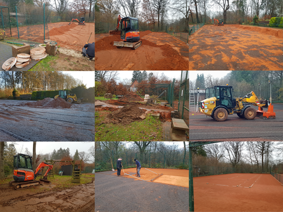 27.11. bis 13.12.2024 – Für unsere beiden Plätze 3 + 4, die entgegen der beiden anderen Courts durch das Jugendtraining auch tagsüber voll ausgelastet sind, zeichnete sich seit Jahren eine Generalüberholung ab. Zumal die beiden Plätze bereits im Jahr 1995 zum 25-jährigen Vereinsjubiläum neu gebaut wurden und somit fast 30 Jahre alt waren. Entsprechend beansprucht war der Untergrund und musste dringend grundsaniert werden. Das milde Klima Ende November kam dem entgegen, denn die von uns beauftragte Firma Kates konnte mit Ausnahme eines Tages (Frost) knapp zweieinhalb Wochen am Stück im Einsatz sein. Täglich haben wir die Bauarbeiten begleitet und konnten dabei viel lernen, was uns für die jährliche Aufbereitung sicherlich nützlich sein wird. (eine Dokumentation der Bauarbeiten ist im Foto von oben links nach unten rechts gut zu erkennen)