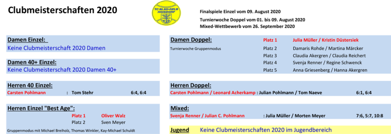 Die Wettbewerbe Einzel und Doppel sind entschieden. Am Ende kam es zu keinen großen Überraschungen. Carsten Pohlmann besiegte in einem packenden Endspiel „Herren / Herren 40“ seinen Gegner Tom Stehr mit 6:4, 6:4 und konnte sich auch direkt im Anschluss im „Doppel Herren“ mit seinem Partner Leonard Achterkamp gegen Tom Naeve / Julian C. Pohlmann mit 6:1, 6:4 durchsetzen. Julia Müller / Kristin Duestersiek konnten den Wettbewerb „Damen Doppel“ für sich entscheiden. Sie gewannen die 5er-Gruppe knapp vor Martina Märcker / Damaris Rohde. Bereits seit einer Woche steht Oliver Walz als Clubmeister „Herren 50“ fest.