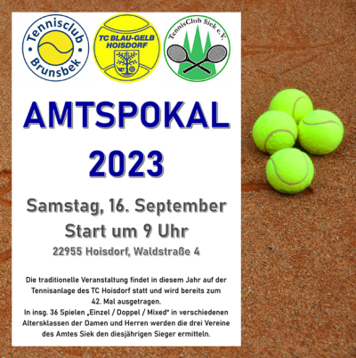 Der Amtspokal der Jugend am Samstag, 09.09.2023 leitete das große Tennis-Wochenende für den Nachwuchs auf der Anlage des TC Hoisdorf ein. Der im Vorjahr durch den TC Brunsbek wieder ins Leben gerufene Wettbewerb wurde von Jugendwart Patrick mit innovativen Ideen und Preisen bestens vorbereitet. Zum Ablauf und den Neuerungen weitere Details + Fotos unter Jugendturnier(e) 2023.