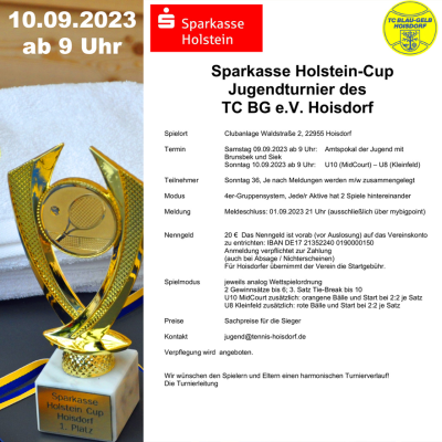 10.09.2023 – Nur einen Tag nach dem Amtspokal für die Jugend, war der TC Hoisdorf erneut Ausrichter einer großen Veranstaltung für den Nachwuchs. Zum dritten Mal in Folge wurde das große Jugendturnier unter dem Namen „Sparkasse Holstein-Cup“ ausgetragen. Viele Kinder der Altersklassen U8 und U10 waren auf den vier Plätzen mit viel Ehrgeiz unterwegs und hatten daneben auch ihren Spaß. Zur Siegerehrung der ersten Spielrunde war unser 1. Bürgermeister Alexander Franz vor Ort und übergab den Kindern gemeinsam mit Jugendwart Patrick die Urkunden, Pokale und Sachpreise. Weitere Infos und Fotos findest Du hier.